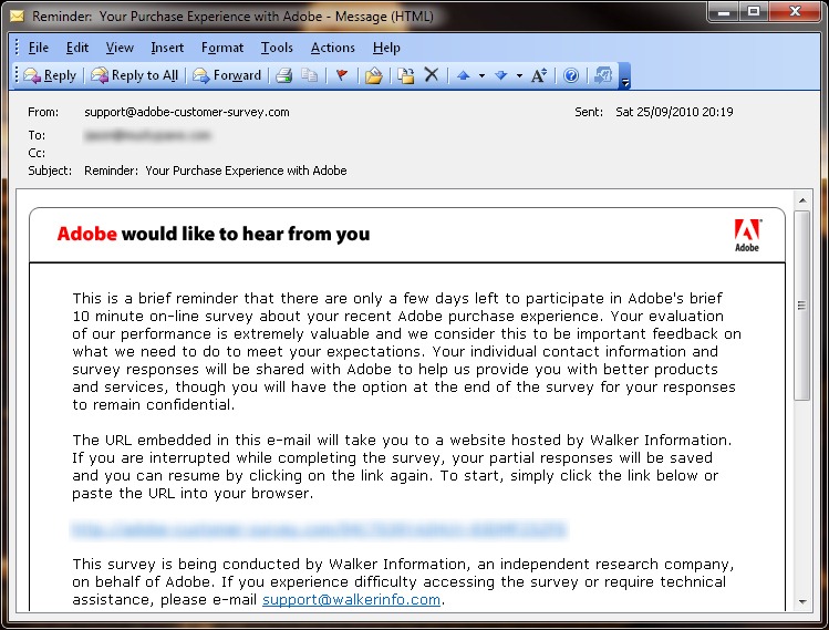 “This is a brief reminder that there are only a few days left to participate in Company X’s brief 10 minute on-line survey about your recent purchase experience. Your evaluation of our performance is extremely valuable and we consider this to be important feedback on what we need to do to meet your expectations.”