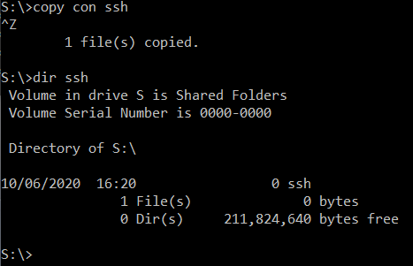 Obviously substitute “S:” with the correct drive on your system. Since Windows doesn’t have a native “touch” command we need to type the following, where you see ^Z replace this with the CTRL+Z keyboard combination and hit Return :-