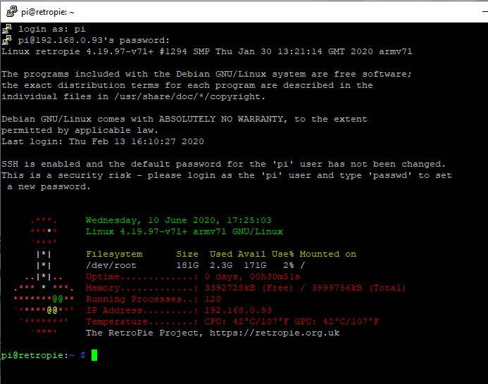 Connect the HDMI cable and Power and it’s time to fire up the Pi. Note it will take a while to start on the first go as it will resize the disks and perform various initialisation functions, on the second boot keep an eye on the text as it flys by to capture the IP address it connects to on your home network. (if you have a wired keyboard, this won’t be necessary, we will need it to configure bluetooth keyboard, mouse and controller. Looking at the messages whizzing by, I note the IP address assigned (assuming you have correctly entered your WiFi Network Name and Password) as 192.168.0.93 which I will use to connect to the Pi using SSH or PuTTY, this IP address may be different for your project, you will need to use your IP address.