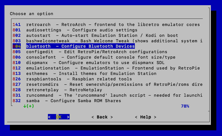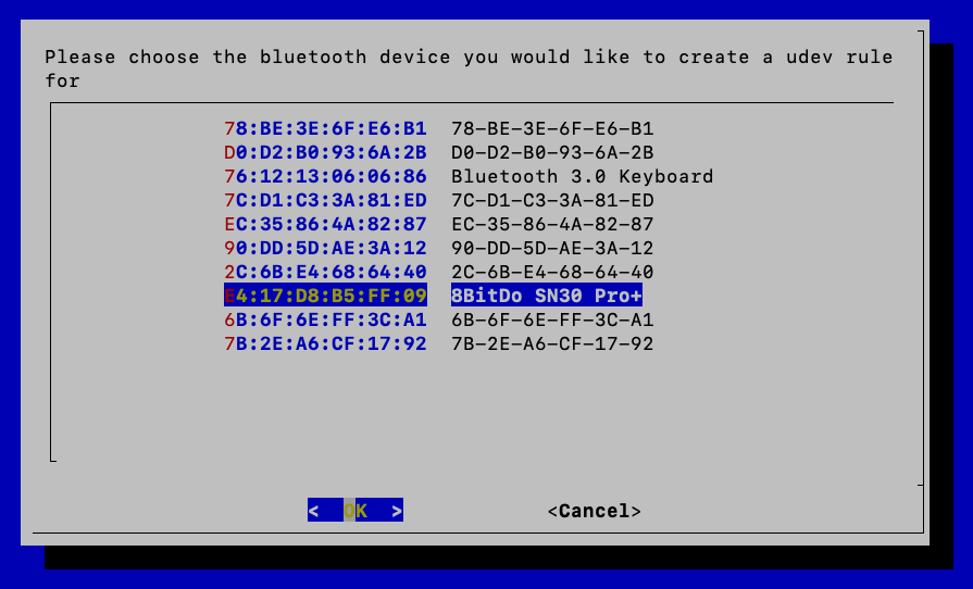 After lots of experimenting, I found that the Bluetooth connection mode worked best when set to BOOT rather than Default as this allowed the controller to reconnect more reliably on restarts, or screensaver mode. I’m unsure if that’s a bug with the build. In addition, you will need to set a udev rule up for the 8Bit Do controller. Sounds complicated? It’s fairly straight forward and the screen shots below will take you through the configuration process. Just repeat for each bluetooth device you want to connect, or in some cases, it may only be the controller as you won’t be playing keyboard games.