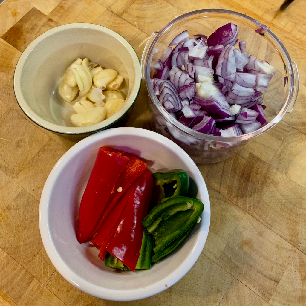 Chop and Slice the onions, and prepare your garlic cloves.