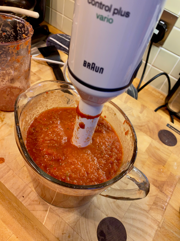 Add another 150ml of water to the sauce and continue to blend until the mix is reasonable smooth, before transferring to a pan to simmer for 10-15 minutes to let the flavours infuse.