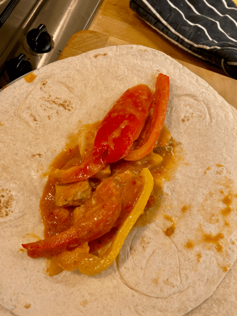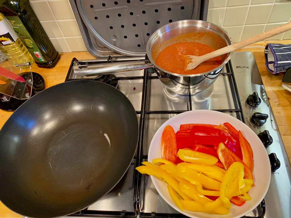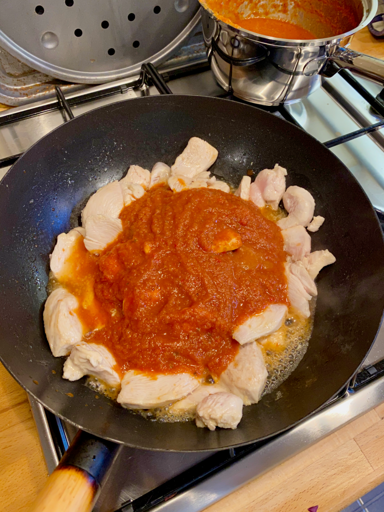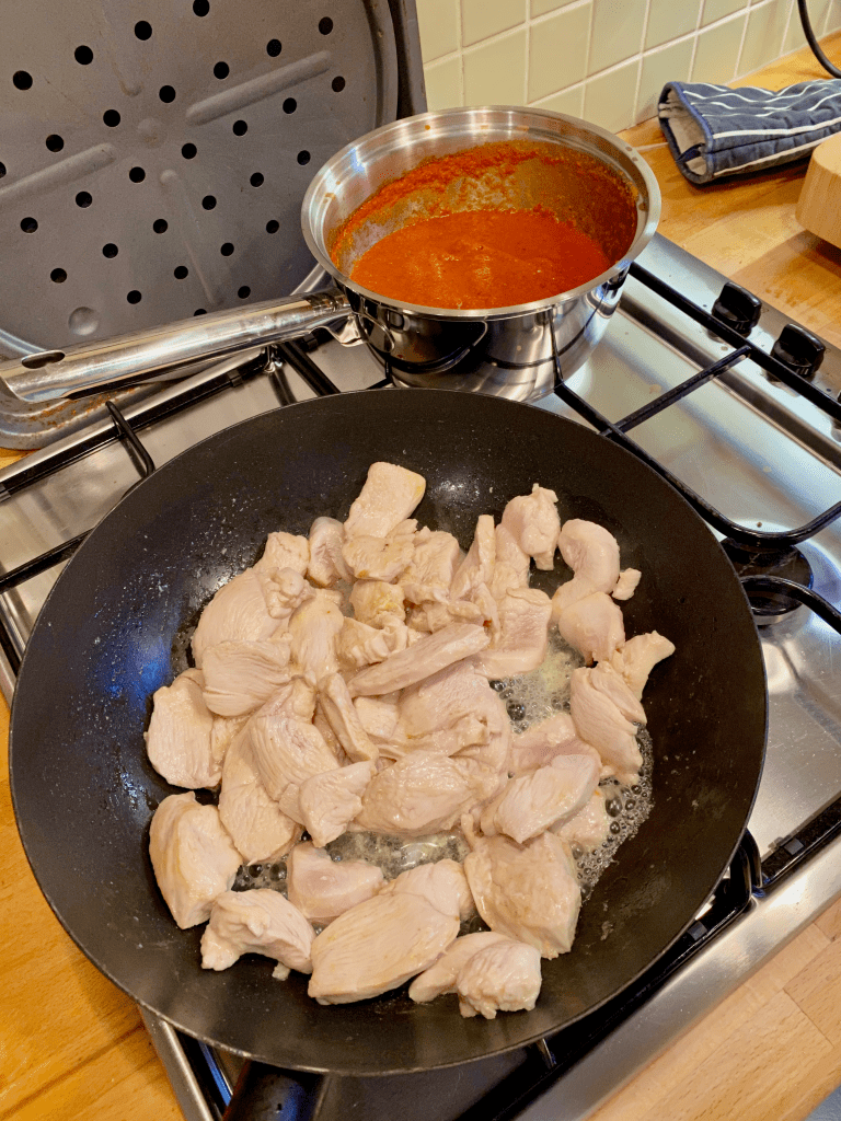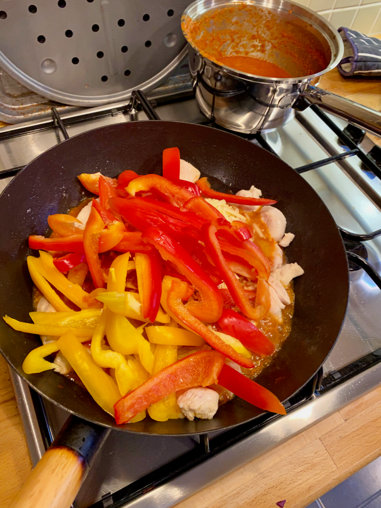 Whilst the sauce is simmering, Throw the chicken into a wok with a little oil and brown the poultry, add the sauce mix (Leave enough sauce to coat the flatbreads), Cheese and Peppers to taste. You can add other veg to taste.