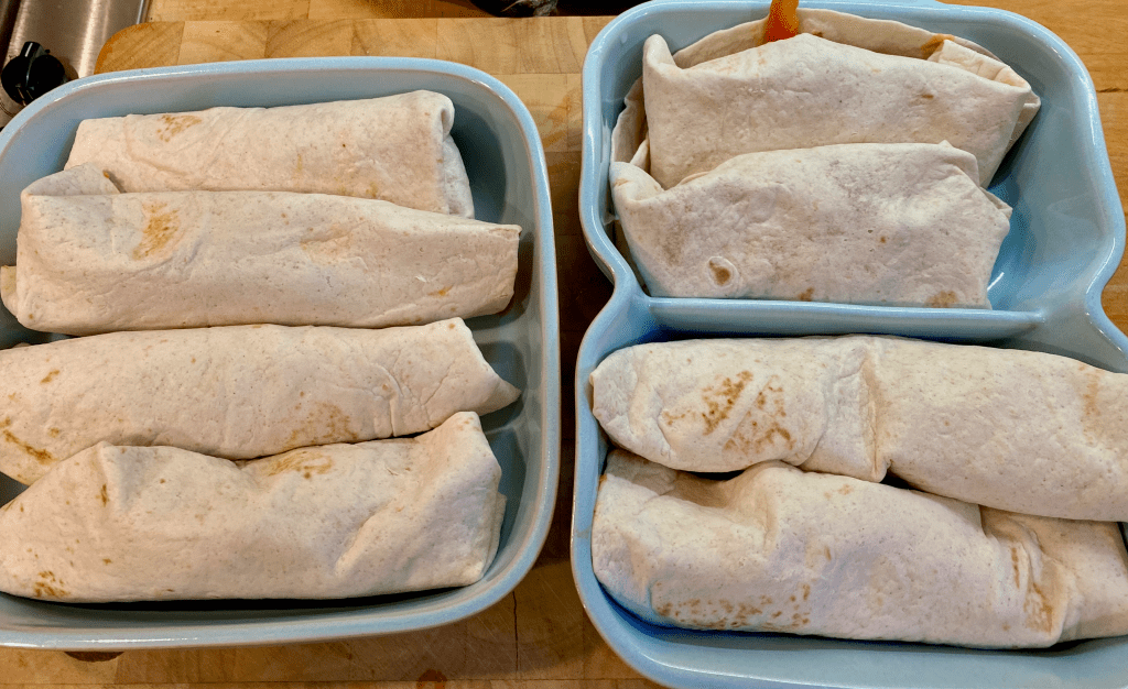 Finally the fun part, take your mix and scoop some onto the middle of the flatbread, wrap and place in an oven proof dish, repeat until all the mixture is used up.
