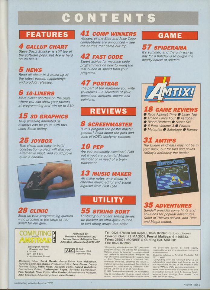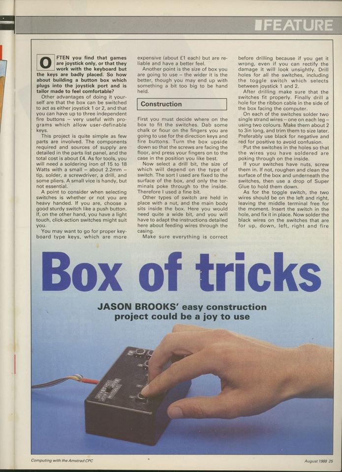 I wrote the article and submitted this in June 1988 detailing instructions on how to build one (Including a switch to choose Joystick One or Two) not only was it good enough, it made the front page of the August 1988 magazine, and landed two and half pages, which meant I could afford the Amstrad CPC Firmware Manual, a HackIt (By Siren Software) and change to buy new clothes with too!