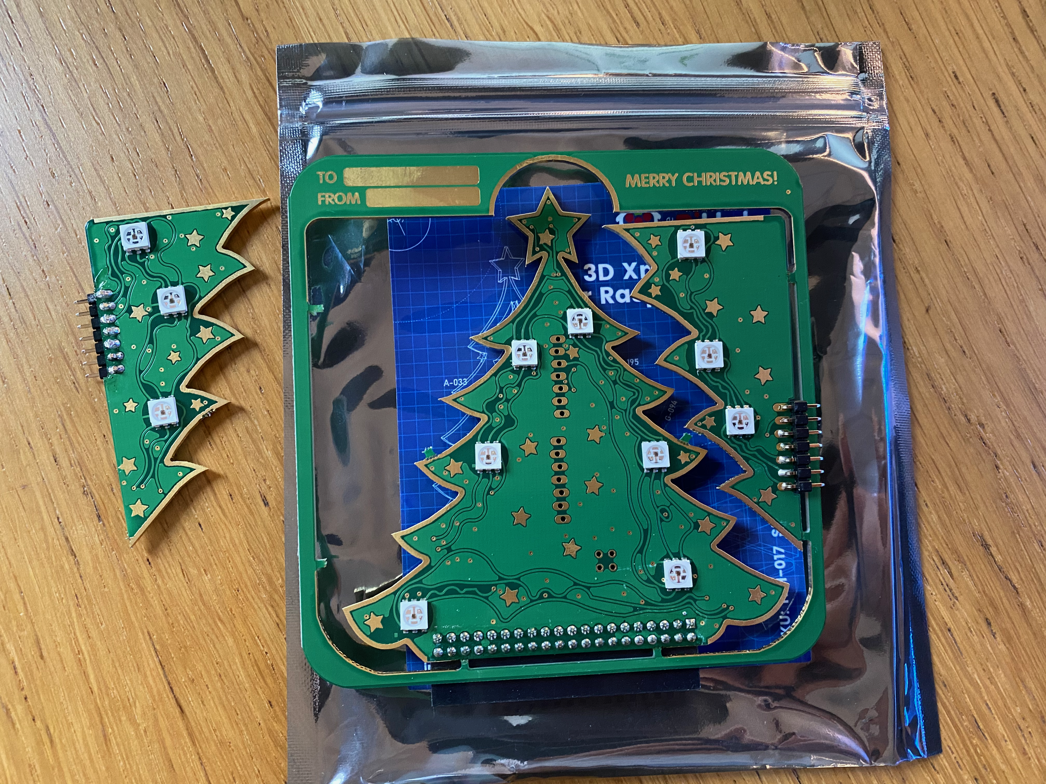 Simply pop the parts off the frame (you may need snips) and slot the parts of the Christmas Tree together, and attach to the Raspberry Pi. Note the right angled pins are to face the HDMI port as you can see below. There’s no need to solder these parts since friction will work. That said, there’s nothing stopping you making it a permanent and solid connection.