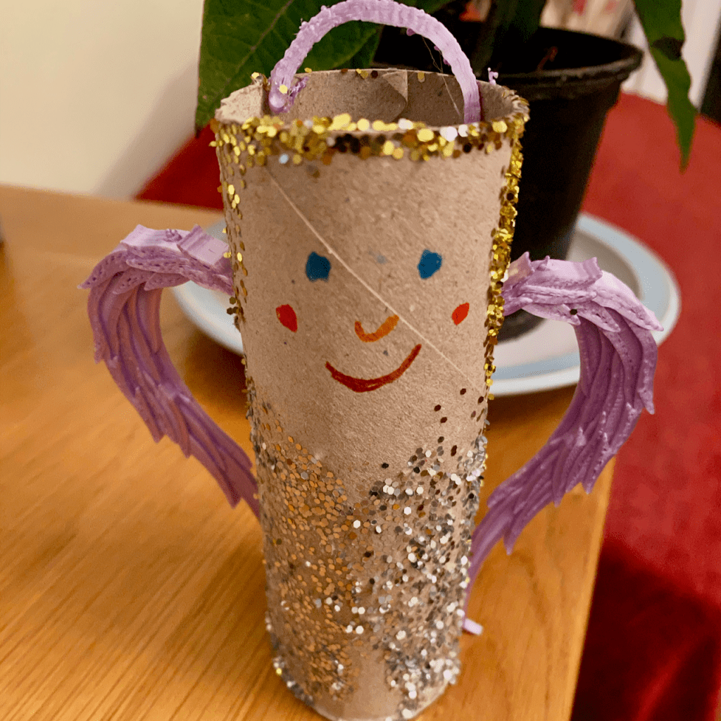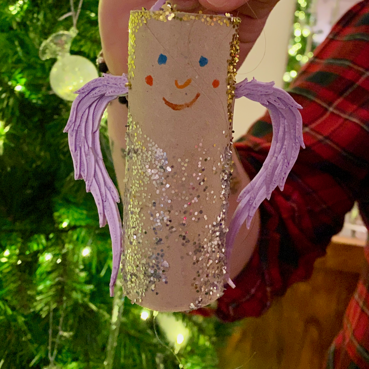 Ha! I thought to my self, and put the printer to good use, sourcing a pair of Angel wings from Thingiverse https://www.thingiverse.com/thing:2399757 by Steveo. I sliced and printed the wings in Silk Purple PLA, put holes in the empty loo roll, drew a face, covered in Glue and Glitter and then had to wait my moment. I did give my friend plenty of warnings something wasn’t right with the tree.
