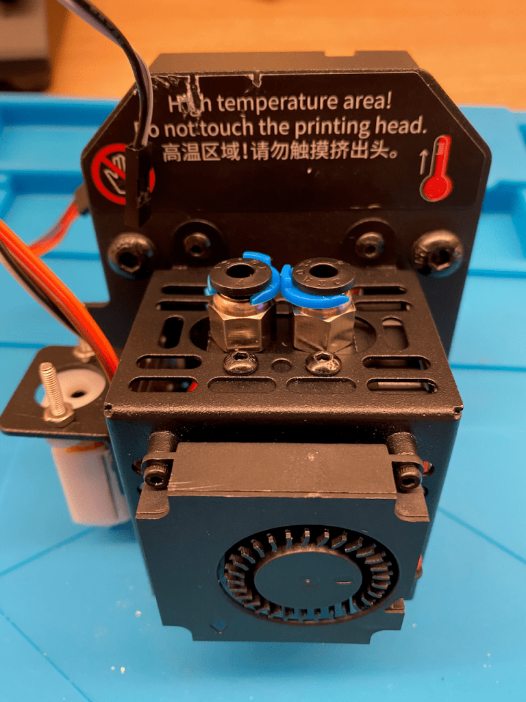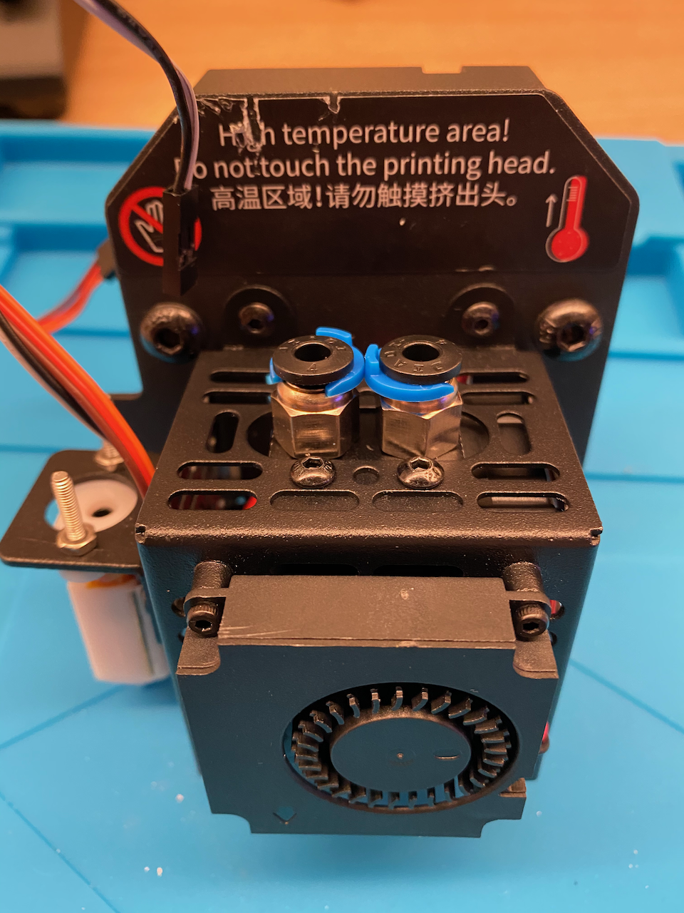 - Remove the Bowden tubes plus inlet valves to use the bigger clearing tool to pull the molten plastic out.