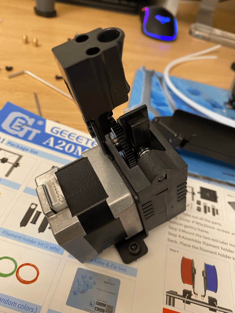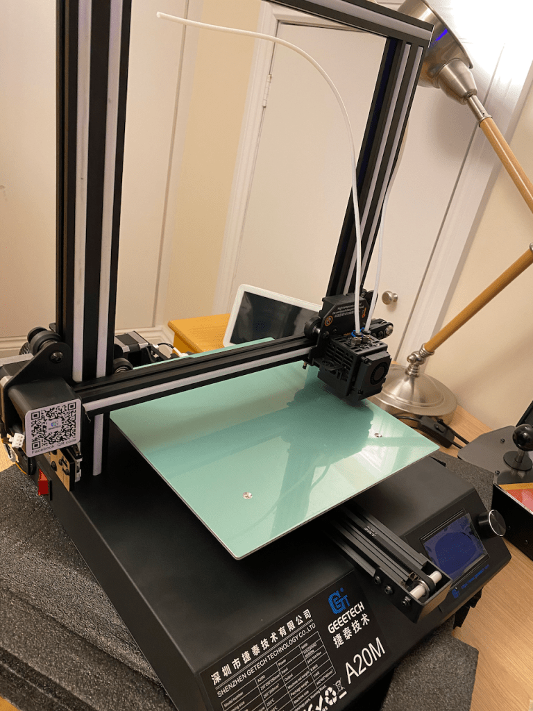 Price of 3D printers have become more affordable than they were five years previously. After much deliberation, I chose a Geeetech A20M Dual Filament Printer. It fitted my criteria of a medium sized bed, good reviews, and low cost point. I’d asked friends who had been printing for much longer and they all said they wish they’d gone multi-extruder, hence the multi-extruder model and not the single.