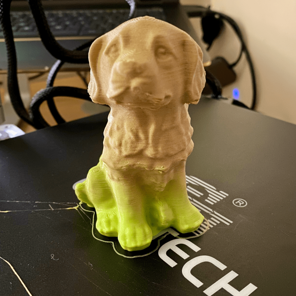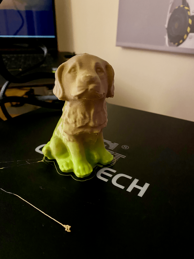 As the initial layer of molten plastic was being printed, it looked a mess. Not knowing better I thought this was normal (It’s not, its a sign of either an unlevelled bed, or the print head too close to the print surface). Three hours later I had my first 3D Print of the Geeetech Dog printed as a gradient of the two loaded filaments.