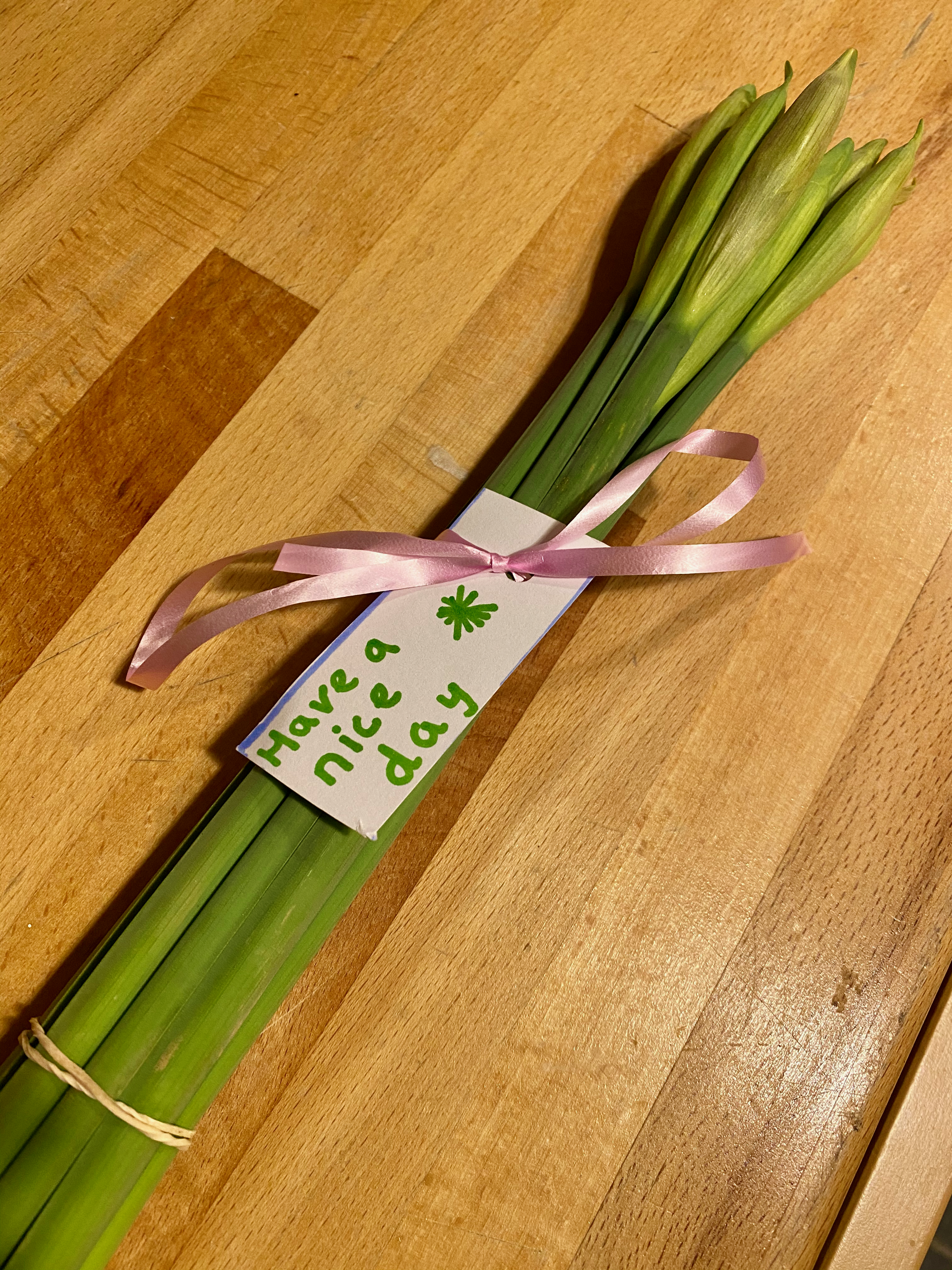 Question is, How do I repay the kindness without looking like a creepy old man? Just accept the gift for what it was, a cheerful reminder that spring is coming and that someone’s random selfless act brought a smile to the neighbourhood? Or equally leave a small gift of chocolate on their doorstep as a thank you?