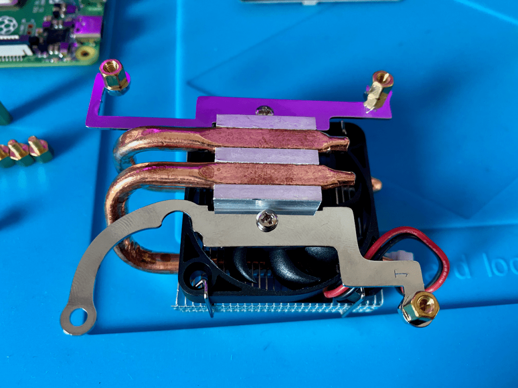 Pretty much everything but the Pi4, including a different ribbon cable for the GPIO which, as they designed the unit, must slot (dubiously?) horizontally between the USB ports on the rear. But it cannot entirely do this without twisting a little to work around the stand off used above one of the Pi4 corner holes. I substituted the tall stand off for a short one.
