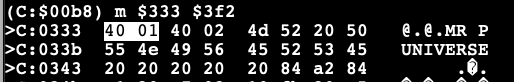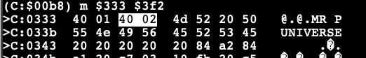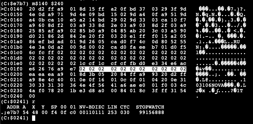 >C:0333 40 01 40 02 4d 52 20 50 @.@.MR P >C:033b 55 4e 49 56 45 52 53 45 UNIVERSE >C:0343 20 20 20 20 20 84 a2 84 .�. >C:034b a1 20 c7 03 10 fb 20 c5 � �..� � >C:0353 03 c9 aa d0 f4 20 c5 03 .ɪ�� �. >C:035b c5 ab d0 ed c4 ab f0 0a ū��ī�. >C:0363 20 be 03 d1 af d0 d7 c8 �.ѯ��� >C:036b d0 f2 a0 fa 20 be 03 99 ���� �.. >C:0373 a1 FF c8 d0 f7 20 be 03 ����� �. >C:037b c5 a1 d0 1f a5 a0 8d 19 š�.��.. >C:0383 FF f0 1a e6 9c c6 a0 d0 ��.�.Ơ� >C:038b 06 a5 9f f0 10 85 a2 20 .�.�..� >C:0393 be 03 91 9b c8 c4 a2 d0 �...�Ģ� >C:039b f6 f0 da a9 30 85 90 a9 ��ک0..� >C:03a3 05 ca d0 fd 88 d0 fa e9 .���.��� >C:03ab 01 10 f6 a9 88 85 01 8d ..��.... >C:03b3 fc 07 8d 3e FF a6 9d a4 �..>��.� >C:03bb 9e 58 60 18 a5 a1 65 a7 .X`.��e� >C:03c3 85 a1 a9 7f 48 98 48 ad .��.H.H� >C:03cb 19 FF 49 7f 8d 19 FF a2 .�I...�� >C:03d3 8f a0 01 a9 10 24 01 f0 .�.�.$.� >C:03db fc 24 01 d0 fc ad 03 FF �$.���.� >C:03e3 8e 02 FF 8c 03 FF 0a 68 ..�..�.h >C:03eb a8 68 6a b0 d7 85 a7 00 �hj��.�. (C:$0403) m$225 >C:0225 4e 4f 56 41 a6 ae e0 01 NOVA���.