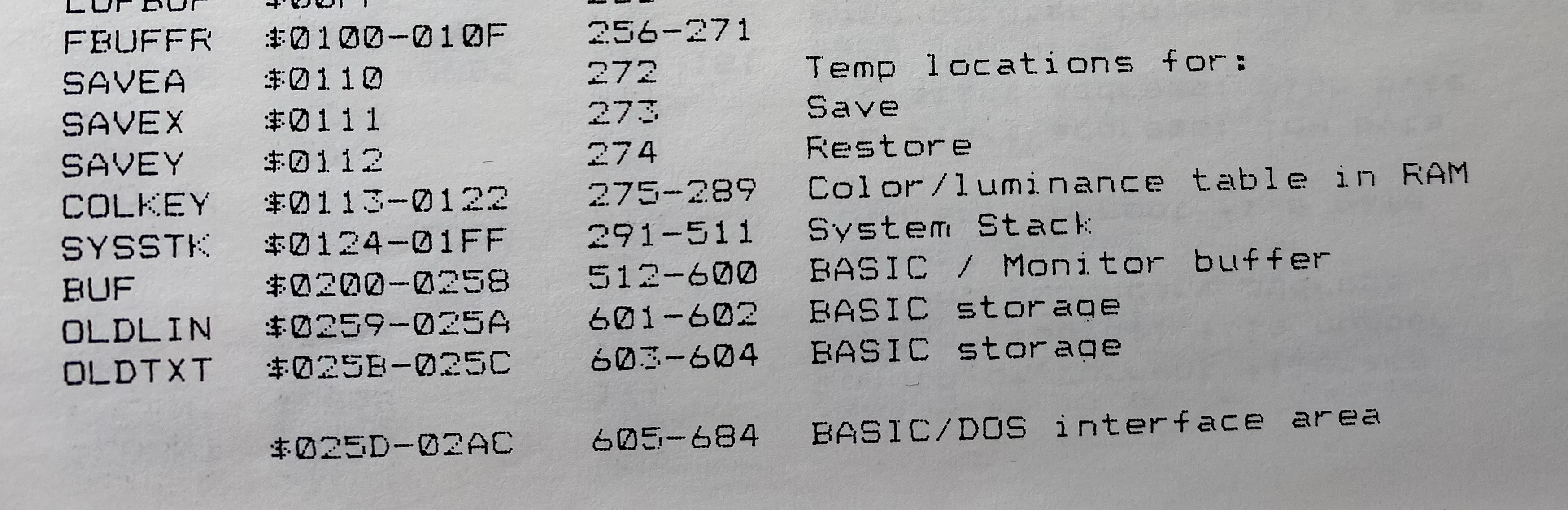 Interestingly PAGE1 has additional uses, the first 16 bytes are used for Floating Point Conversion buffer space, Colour Luminance Table and Kernel Save Information. Leaving only $0124 – $01FF for the actual system stack.