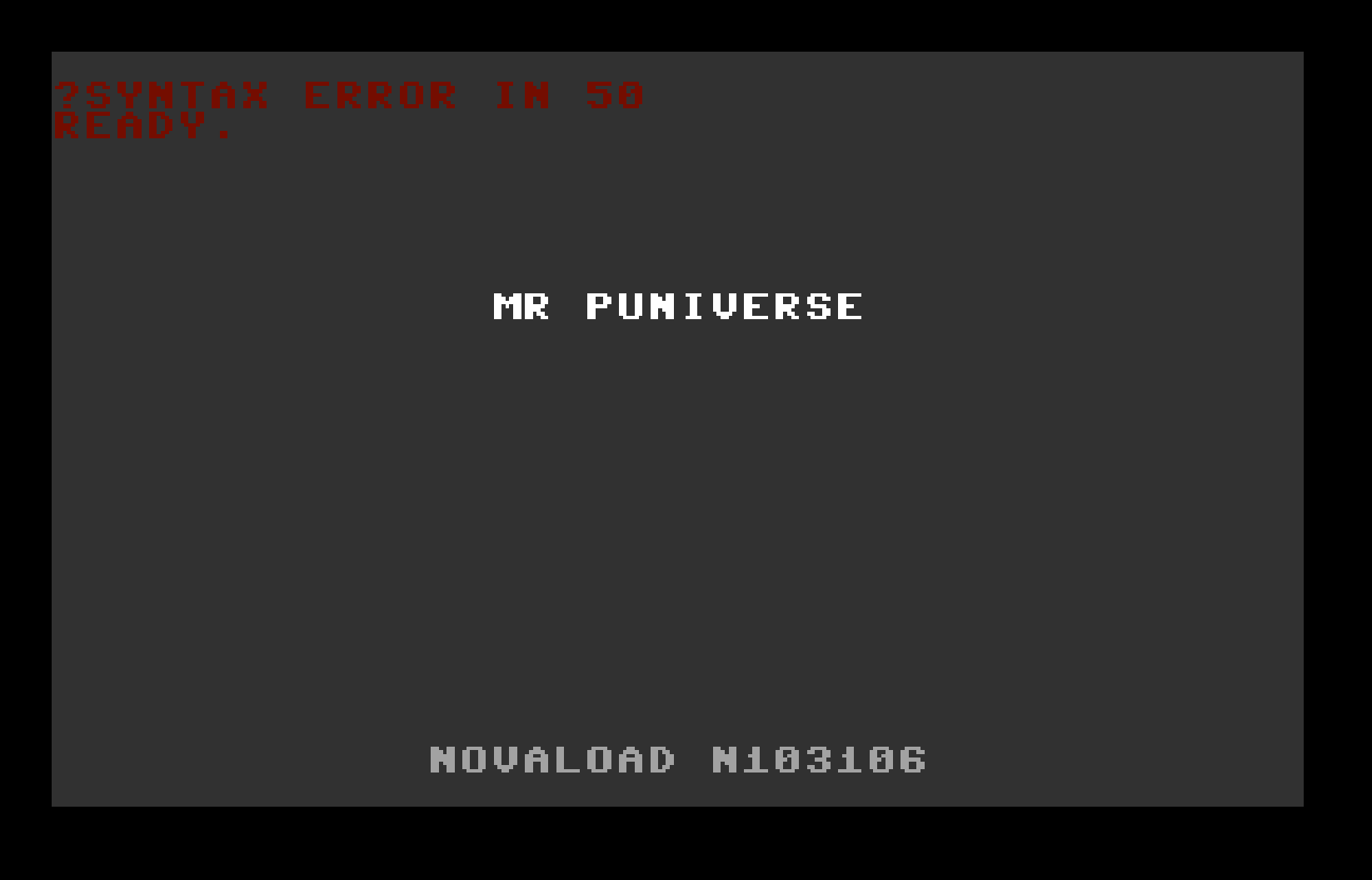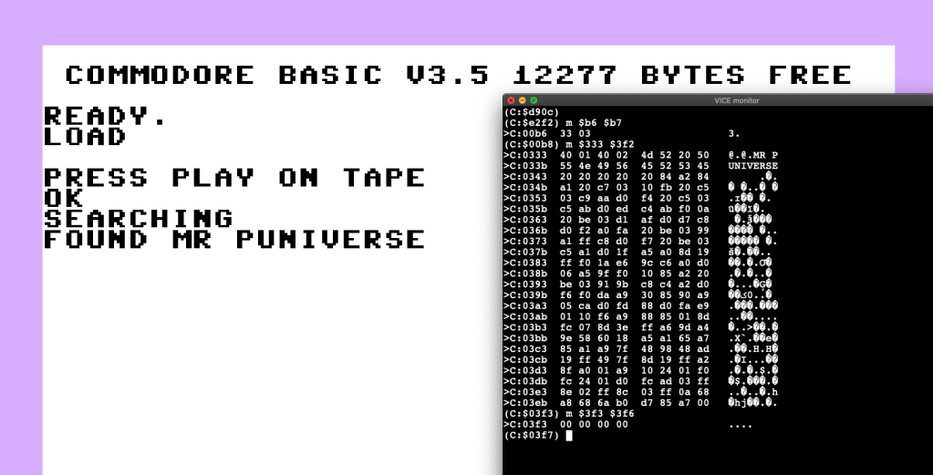 Attach the “Mr Puniverse” Tape image to your emulator or real C16 if you’re going hardcore, type LOAD and as soon as the “FOUND MR PUNIVERSE” message appears, activate the emulator Monitor.