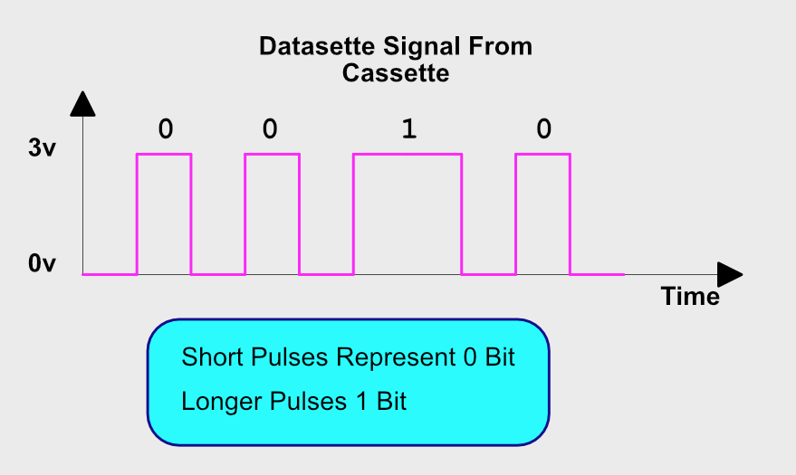 You guessed it, these counters are set and used to time the length of 1 and 0 signals. For illustrations, a very crude diagram below, shows a “Perfect” signal over time and a voltage read on the Datasette Port. If you had an oscilloscope you would see a slant in the rise from 0v to 3v and an overshoot (Noise) from the datasette circuitry.