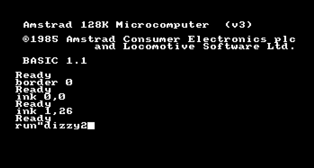 We just set the colours up right? no… and I’ll show you why… We’ll just set up the minimum for this test, set the Border, and INK 0 to Black and INK 1 to White. Now RUN”DIZZY2
