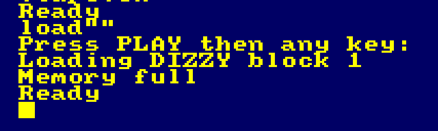 LOAD”DIZZY1.BIN” or LOAD”DIZZY1