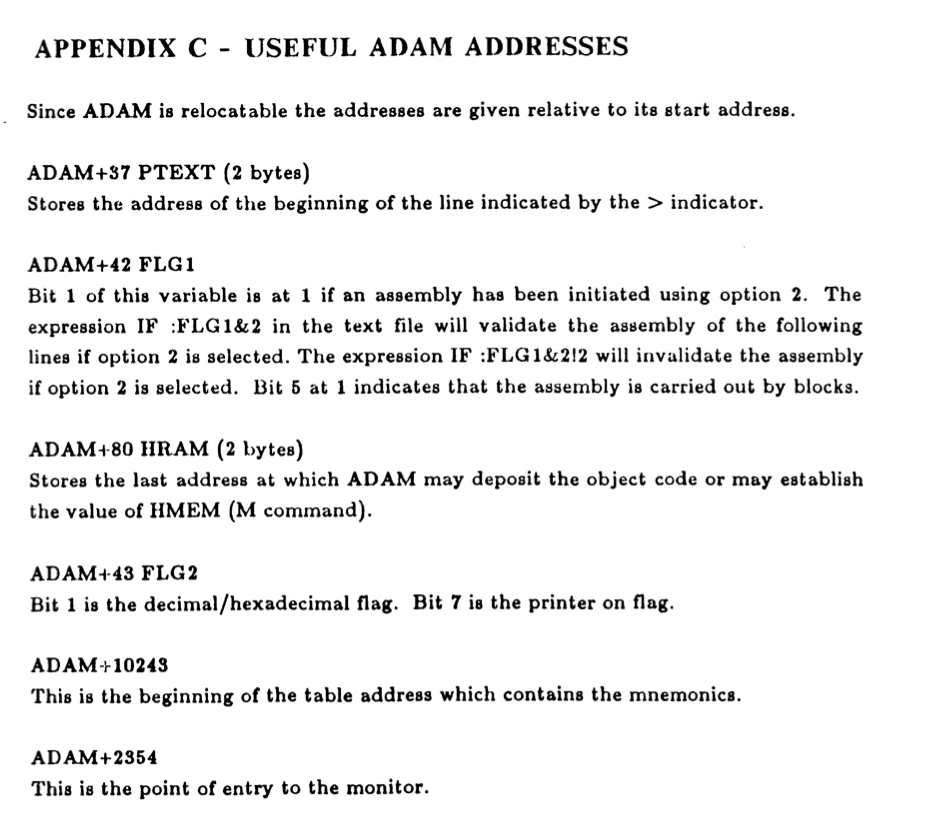 - ADAM Software (Assembler, Disassembler and Monitor), aka, DAMS in Europe.