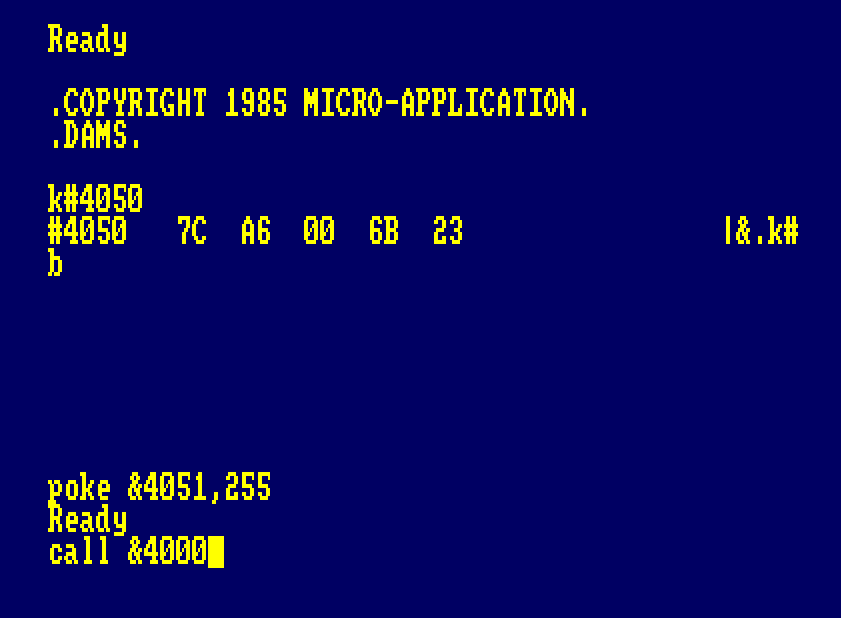 Thankfully, the developer documented some key addresses, we simply drop back to BASIC, POKE &4051,&FF and jump back into ADAM. The code now assembles.