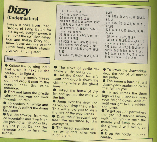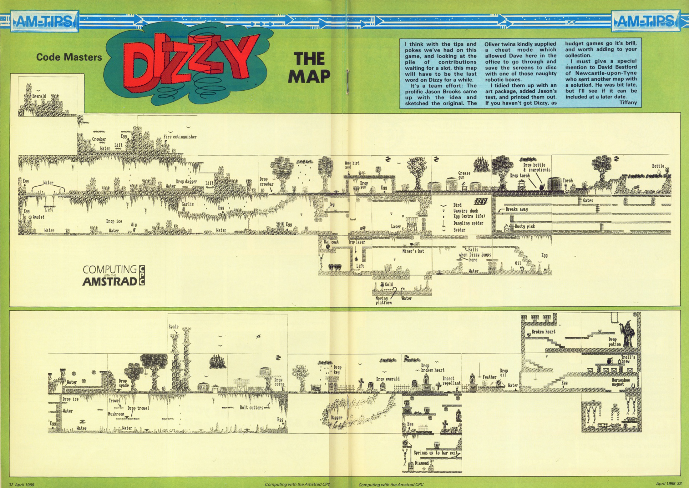 I was fairly prolific in the 80s across multiple platforms, much of my stuff was published in magazines and 3rd parties (Choice Cheats from First Choice Software, Nemesis, Goldmark etc), for example. In keeping with the game, these cheats I developed were First Published in Computing with the Amstrad CPC January 1988 was the first cheats for Dizzy. There was always a two month lead time from submitting a cheat to publication, and the magazine was usually dated a month or two ahead. The initial cheat would have been submitted shortly after release of the game in 1987. I loved the game so much, I created additional cheats, and a Map with solution that had a double page spread. My editor at the time, Ian C. Sharpe had enough of Dizzy cheats and so no more could be submitted. However there’s a story behind all this which I’ll reserve for a later post.