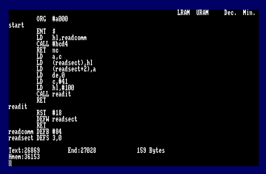 The program below (slightly simplified since we’re only reading a single sector) searches for command #84 – Read Sector, and sets up the address and ROM for a FAR CALL via RST#18.