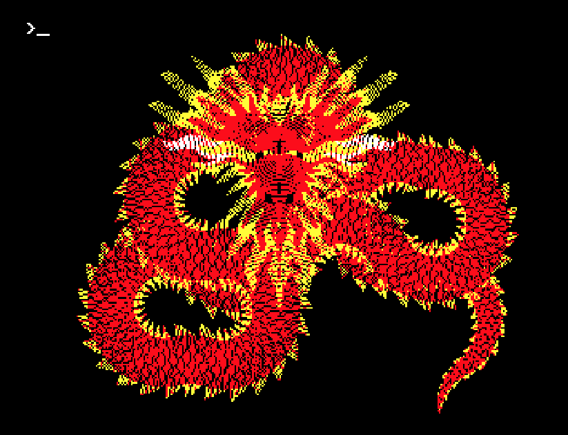 What makes this so clever is that it is not drawing a dragon in the traditional sense. There is no sprite, no stored image, and no list of dragon-shaped coordinates. Instead, the code uses trigonometric functions and repeated plotting to build up a twisting body, scale-like textures, spikes, and finally a mirrored head shape. In other words, the dragon emerges from the maths rather than being explicitly drawn.